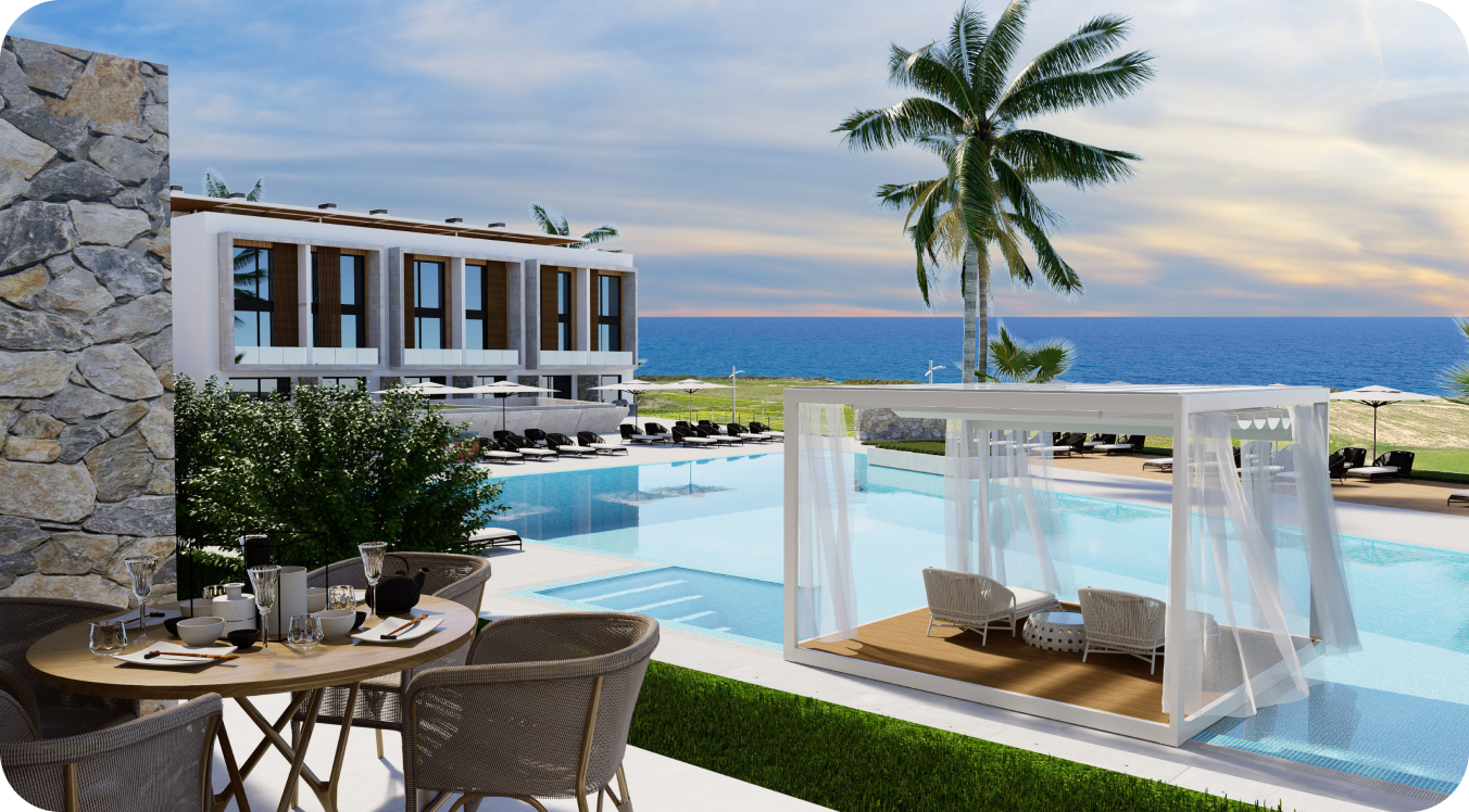 About the complex:An excellent luxury project located on the high cliffs of the Mediterranean coast in one of the most popular regions of Northern Cyprus - Esentepe. The residential complex is located on the first coastline and offers its residents elegance, serenity and unity with nature.